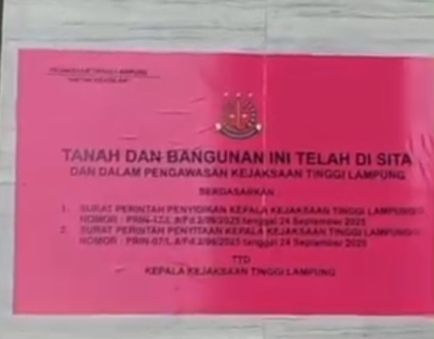 Dalam video yang beredar di masyarakat, terlihat sejumlah penyidik menempelkan stiker yang menyatakan bahwa tanah dan bangunan tersebut telah disita dan berada dalam pengawasan Kejati Lampung. Bangunan berwarna putih krem tersebut juga telah disegel menggunakan garis Kejaksaan berwarna putih.